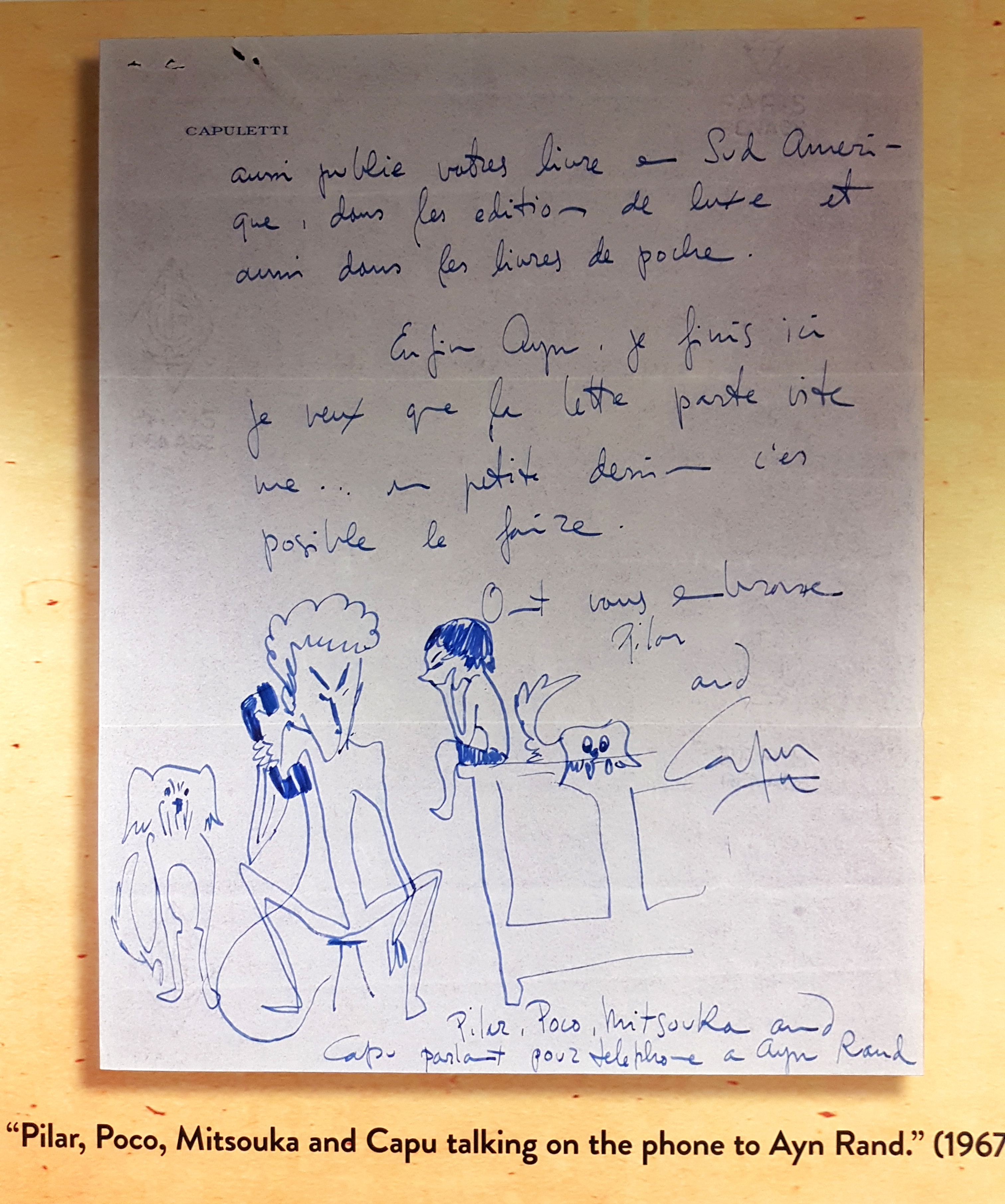 En ce qui concerne la peinture, les bureaux du ARI étaient un peu partout agrémentés de petits dessins qui étaient je pense réalisés par la sœur d’Ayn Rand, et que cette dernière adorait. Mais il y avait aussi et surtout des peintures de Jose Manuel Capuletti, disciple de Salvador Dalí et ami d’Ayn Rand, qui écrivait d’ailleurs à cette dernière en français, puisqu’Ayn Rand lisait couramment le français.